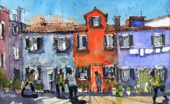 In this line and wash watercolor article and tutorial for beginners, we will draw and paint some colorful Murano houses