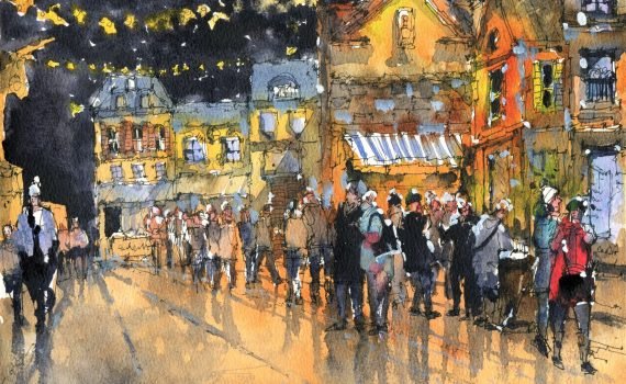In this live watercolor workshop, we will paint a Christmas market scene. Join us for live workshop #23.5!