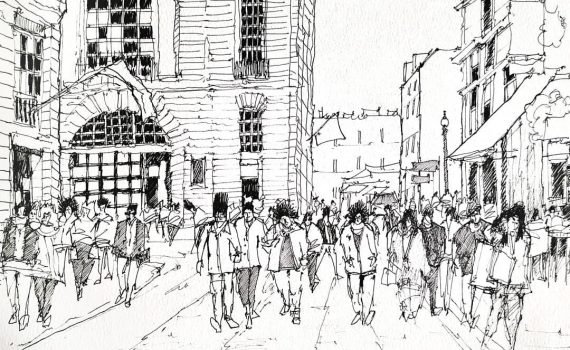 I draw all the figures and details in the foreground first so they appear closer to the front. Once you add the buildings and objects behind – they appear partially obscured. This overlapping of shapes creates the illusion of depth and in my opinion, makes for a more interesting drawing. […]